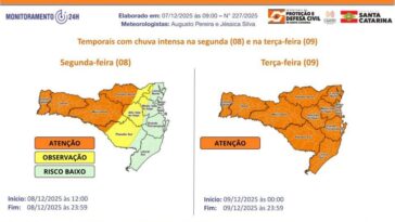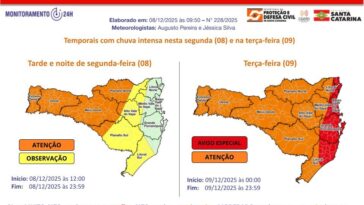 Diante desse cenário, a Defesa Civil de Santa Catarina orienta a população a acompanhar os avisos e atualizações por meio dos canais oficiais e a adotar medidas preventivas, especialmente em áreas com histórico de alagamentos e enxurradas.